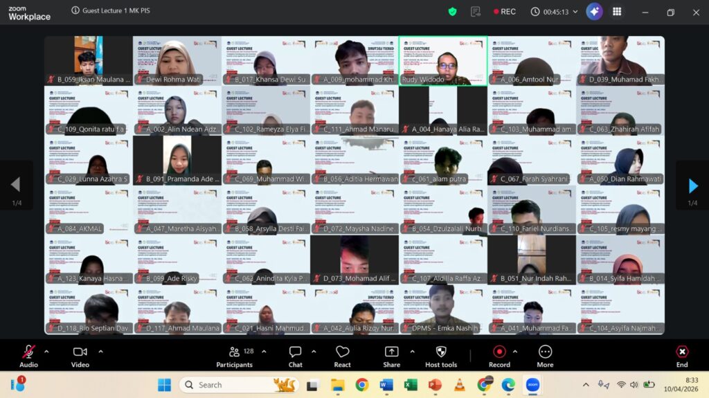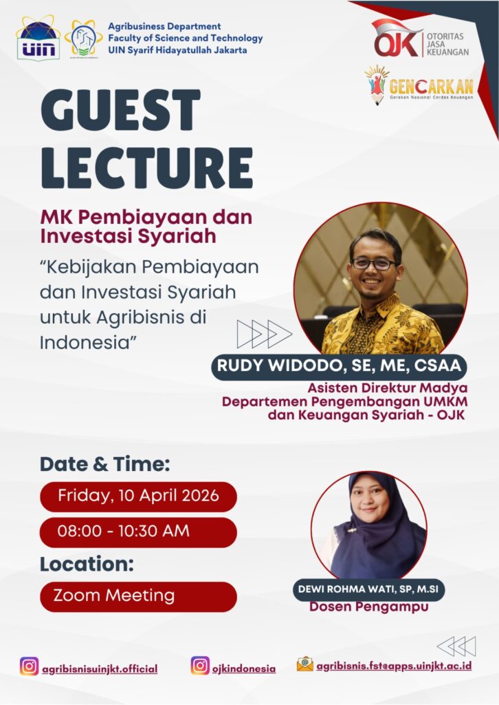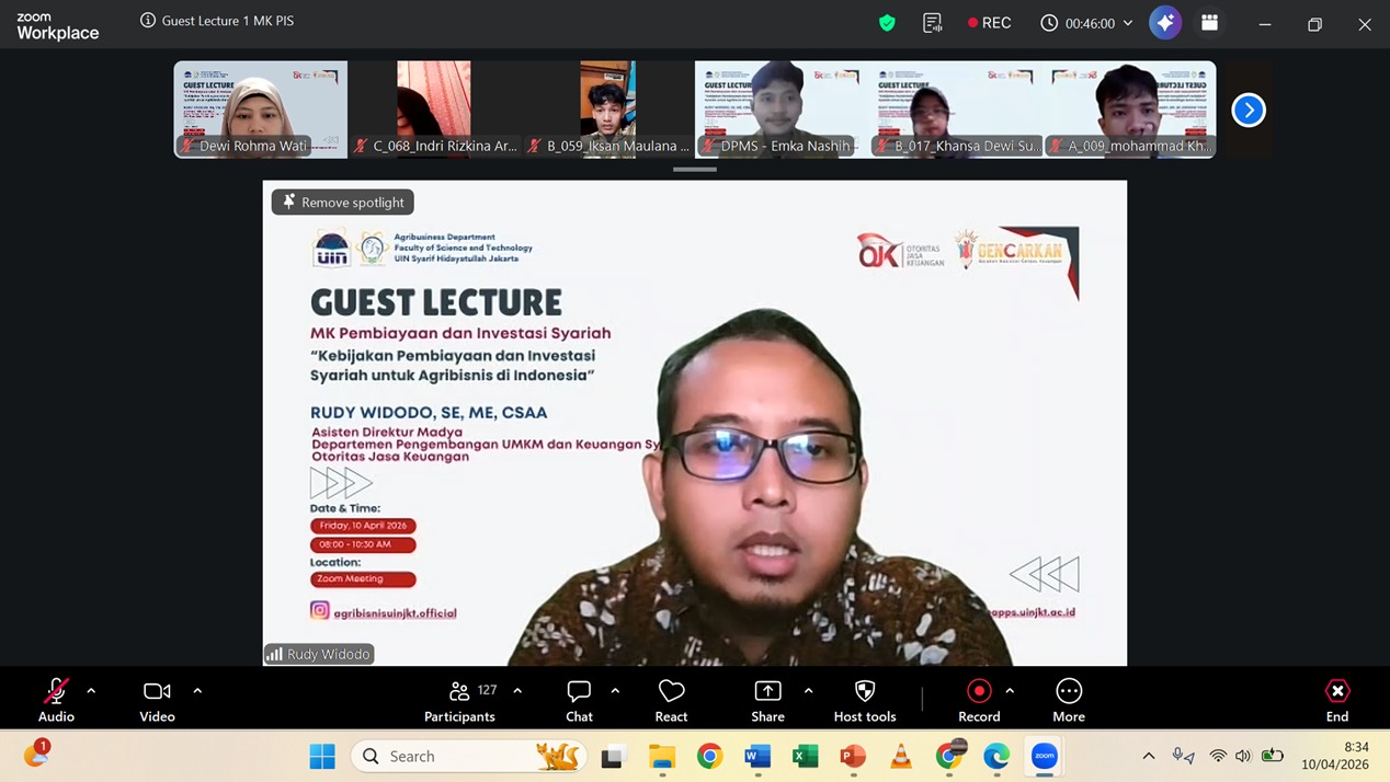 Carrying the theme “Islamic Financing and Investment Policy for Agribusiness in Indonesia,” this guest lecture served as an academic effort to bridge classroom learning with real-world practices and policies. The session was conducted online via Zoom Meeting on 10 April 2026.