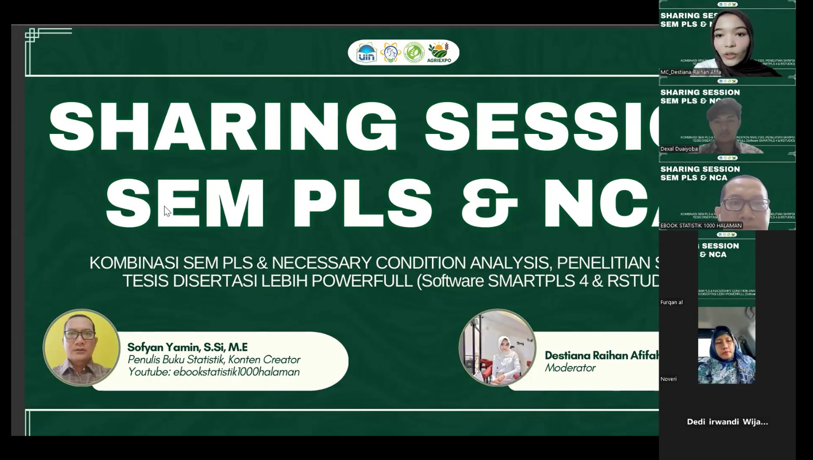 To enhance students’ competencies in quantitative research methods, a Sharing Session on Structural Equation Modeling–Partial Least Squares (SEM-PLS) and Necessary Condition Analysis (NCA) was successfully conducted as part of the academic enrichment program. The activity was attended by students from the Bachelor’s and Master’s programs of the Agribusiness Study Program, UIN Syarif Hidayatullah Jakarta, and was designed to support them in developing strong analytical skills for thesis and dissertation research, particularly in handling complex data analysis using SmartPLS 4 and RStudio.